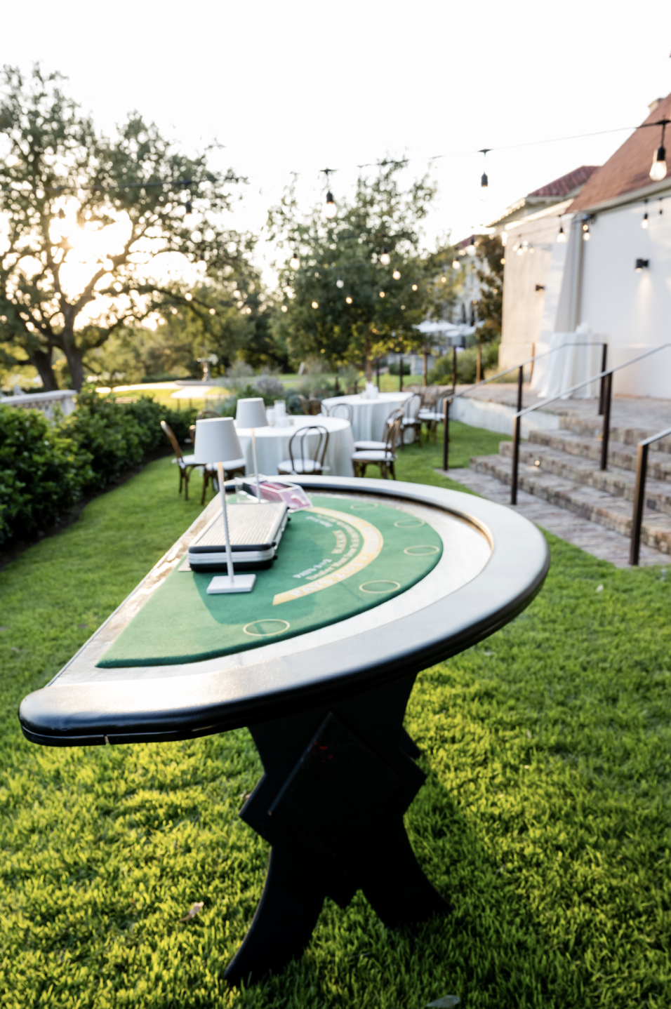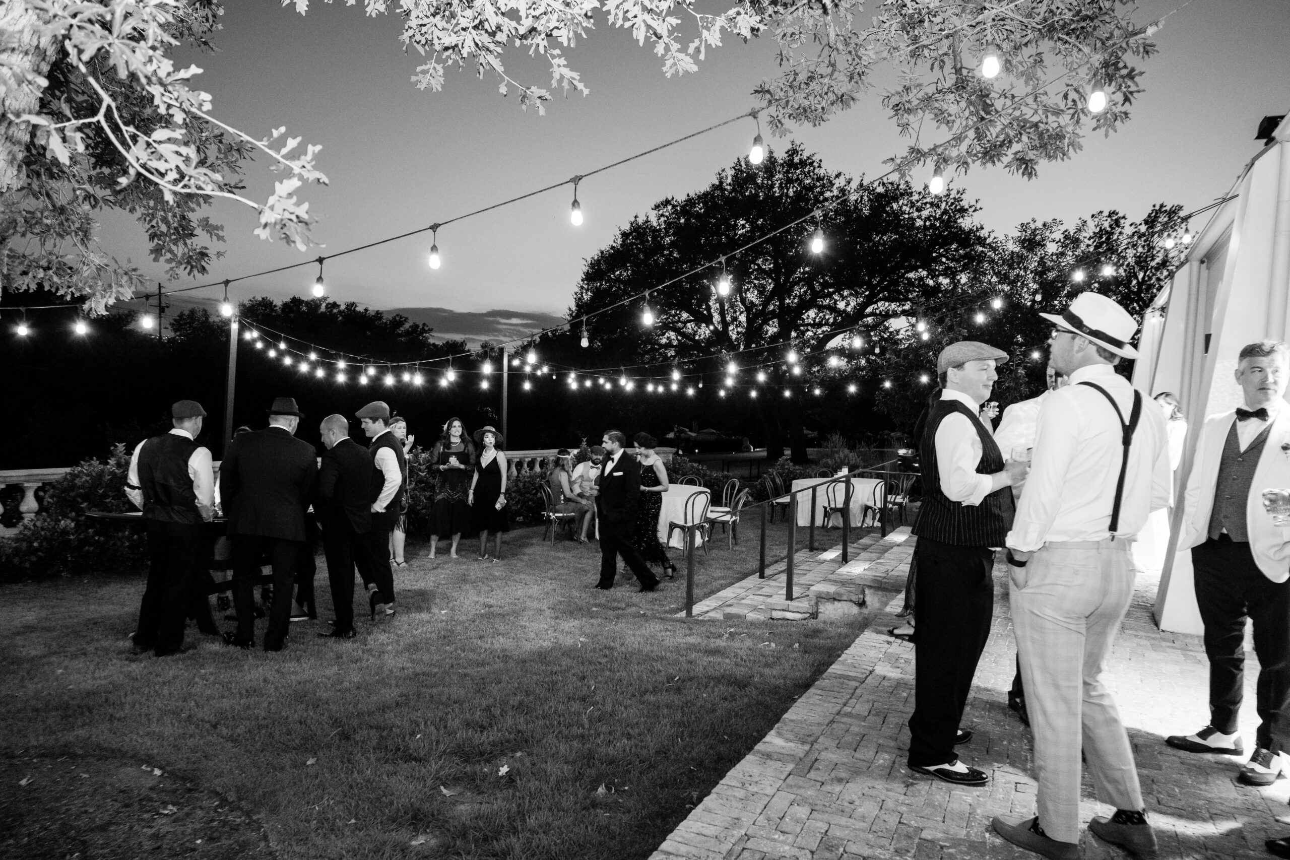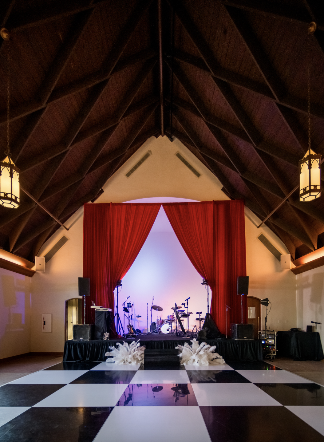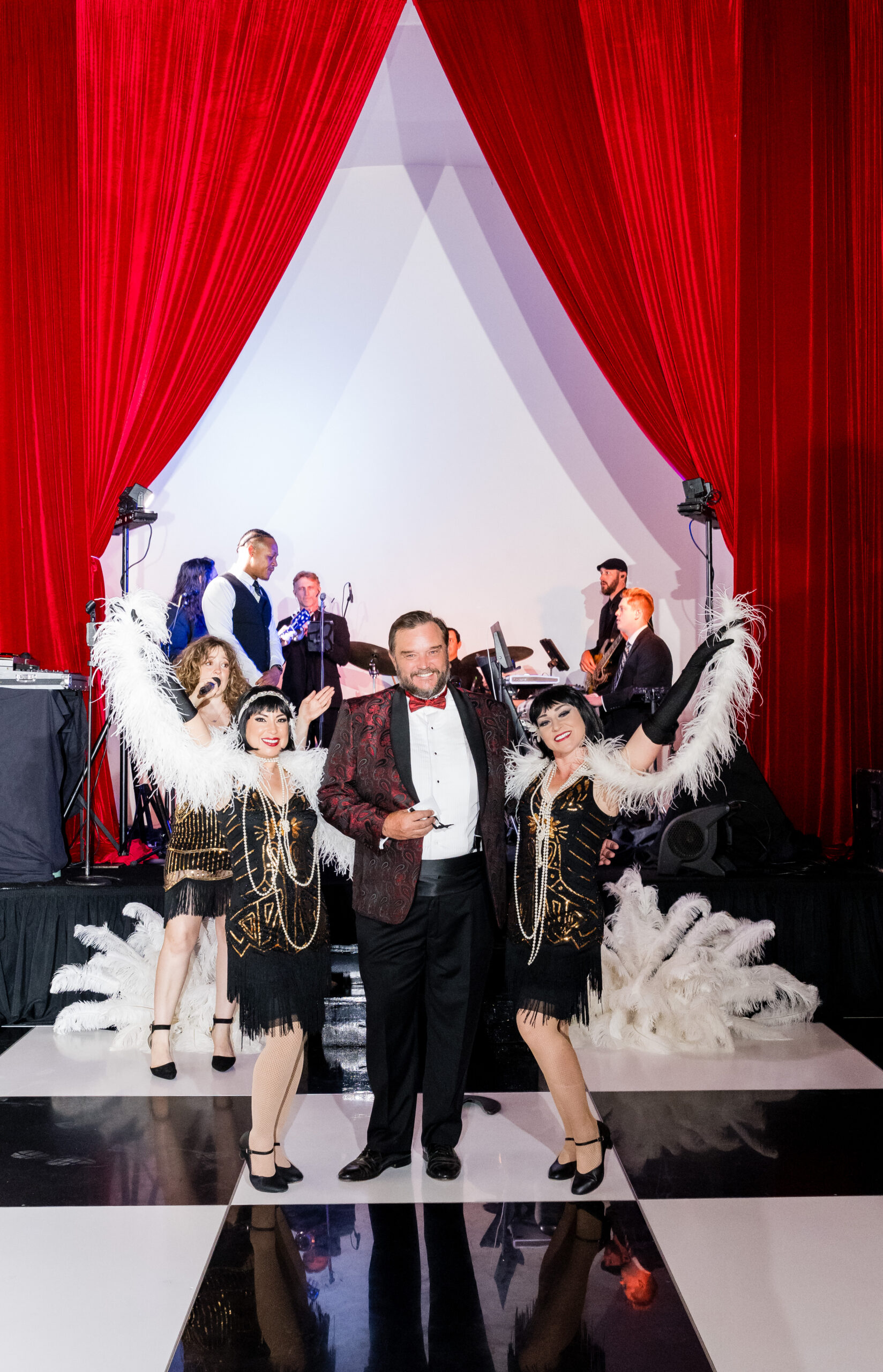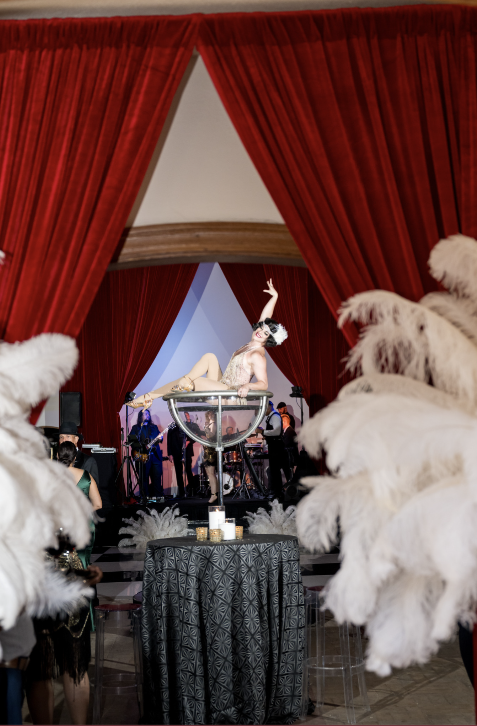 Some of the details we added are still my favorite parts of the whole night. Guests walked down a red carpet as they entered the Chapel, so the party started the second they arrived. Inside, we had red velvet draping by UDE, a martini glass aerialist performing above the crowd (such a showstopper!), blackjack tables that stayed busy all night, a champagne tower, and flapper girls bringing the full 1920s spirit to life. And of course, Commodore Perry Estate gave the whole night that luxe, Gatsby feel.