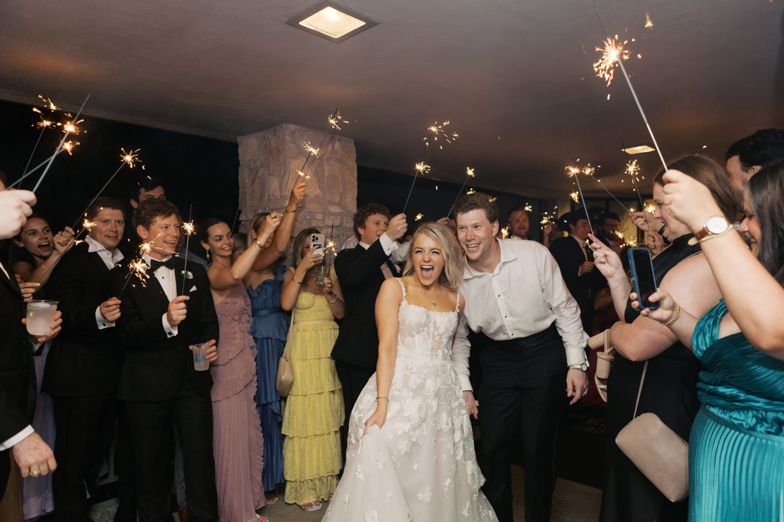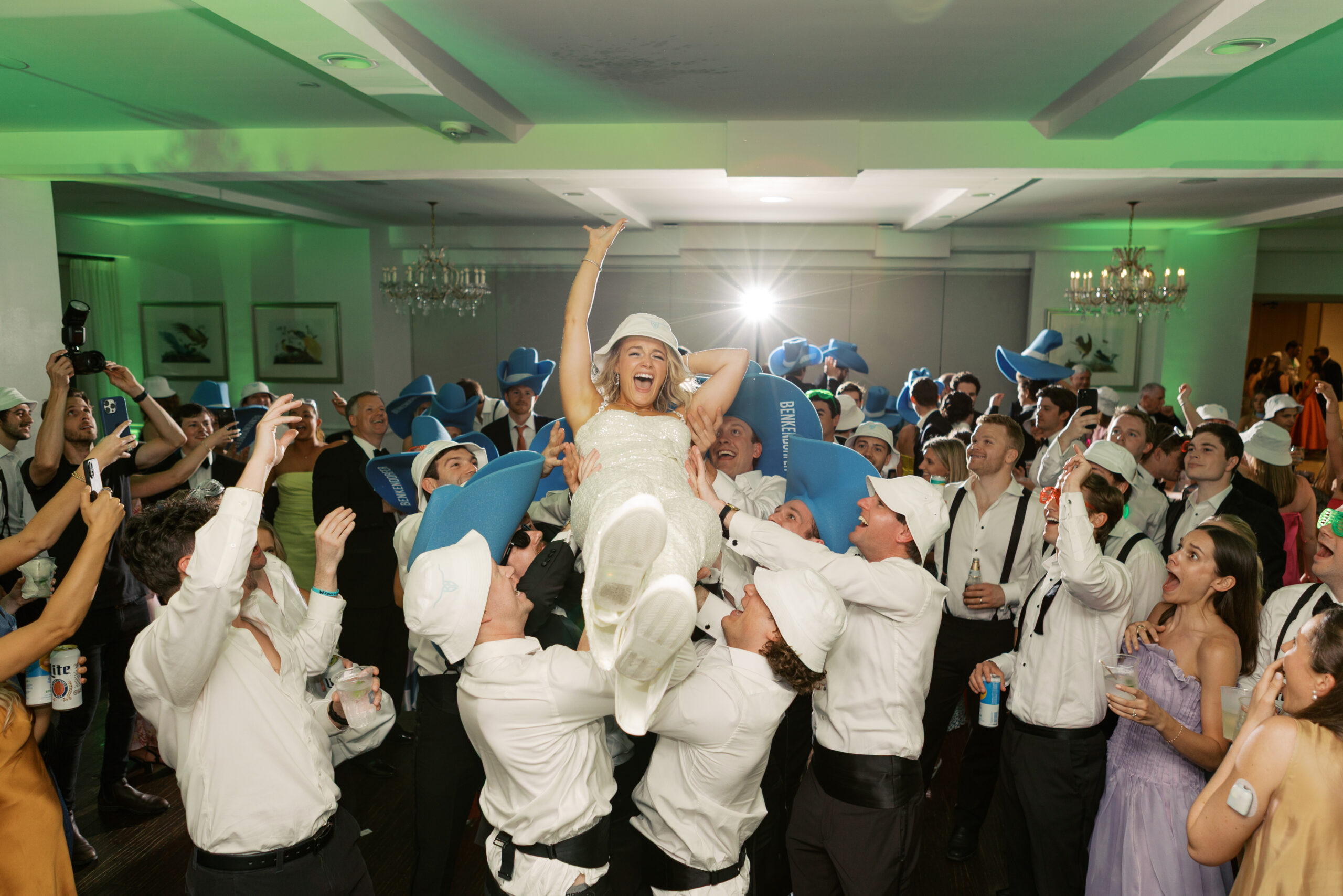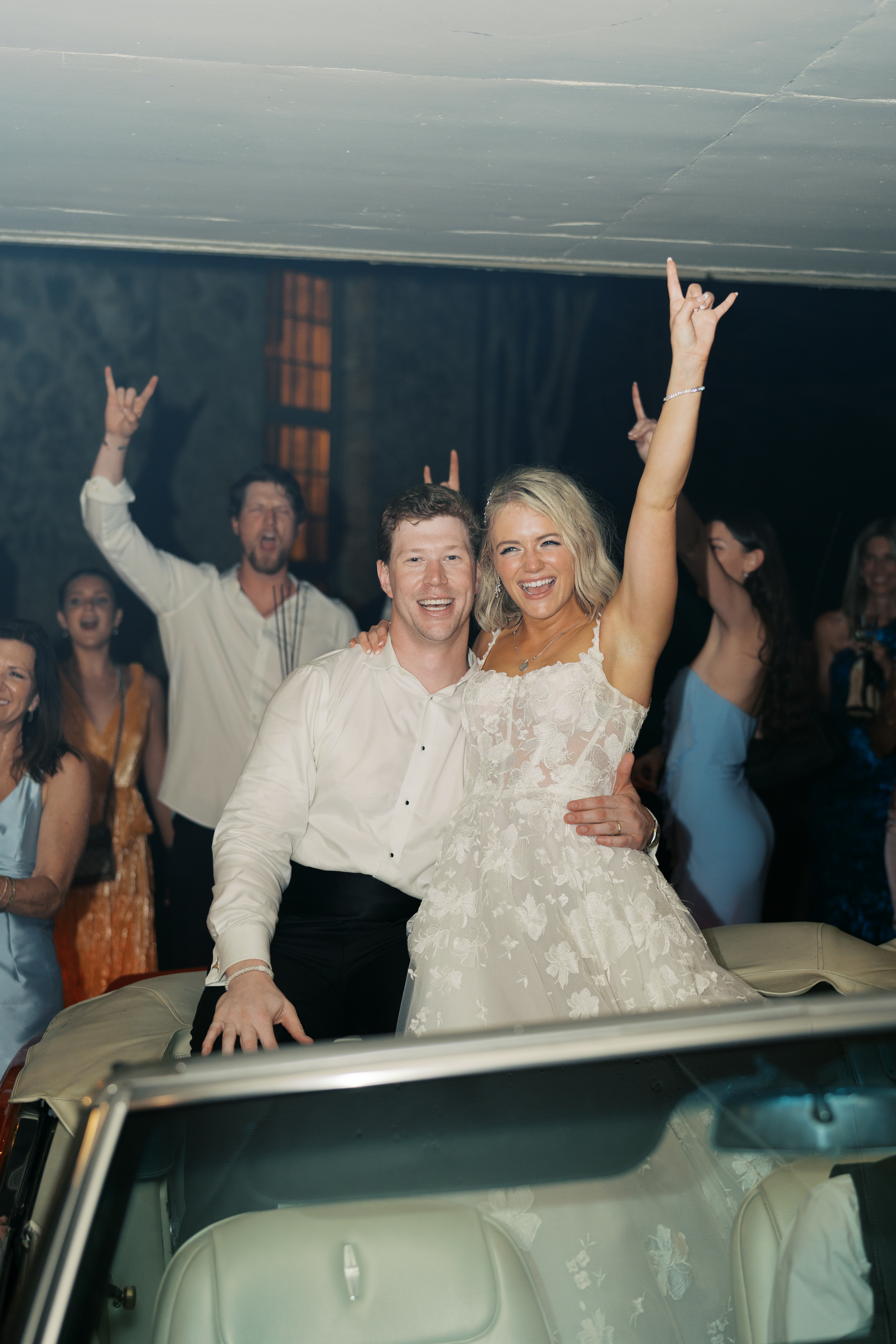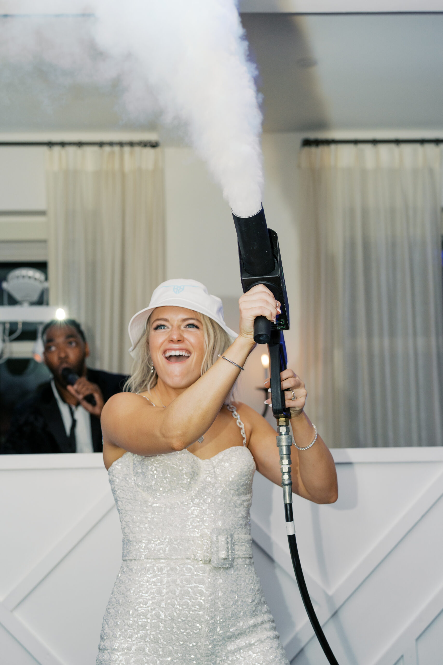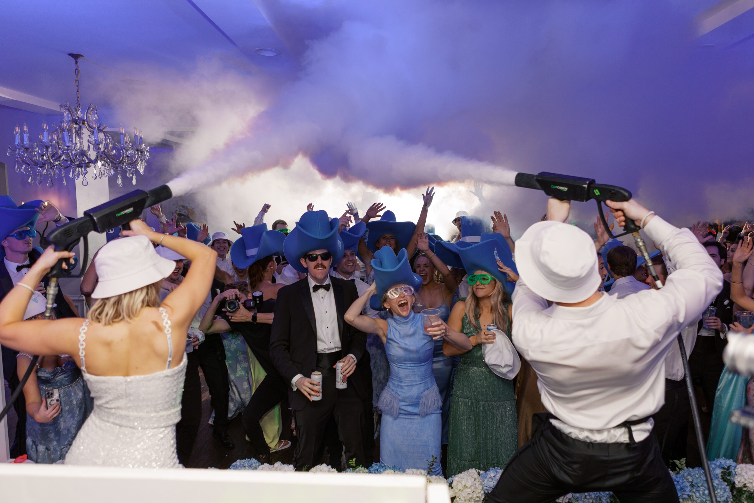 Midway through the evening, Brooke and Brooks staged a faux sparkler send-off before hopping into Brooke’s late father’s cherry red Camaro for a joyride. With Brooke’s brother behind the wheel, it was a heartfelt moment that carried Bobby’s spirit along for the ride. While the couple enjoyed their cruise, guests were ushered back inside for an unforgettable after party. The grand finale featured CO₂ guns, Brooke’s sequin jumpsuit, and of course, oversized foam cowboy hats. It was the perfect finale to a day filled with love, joy, and celebration.