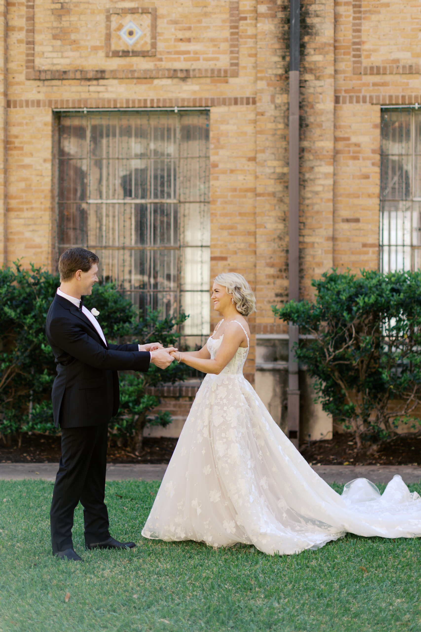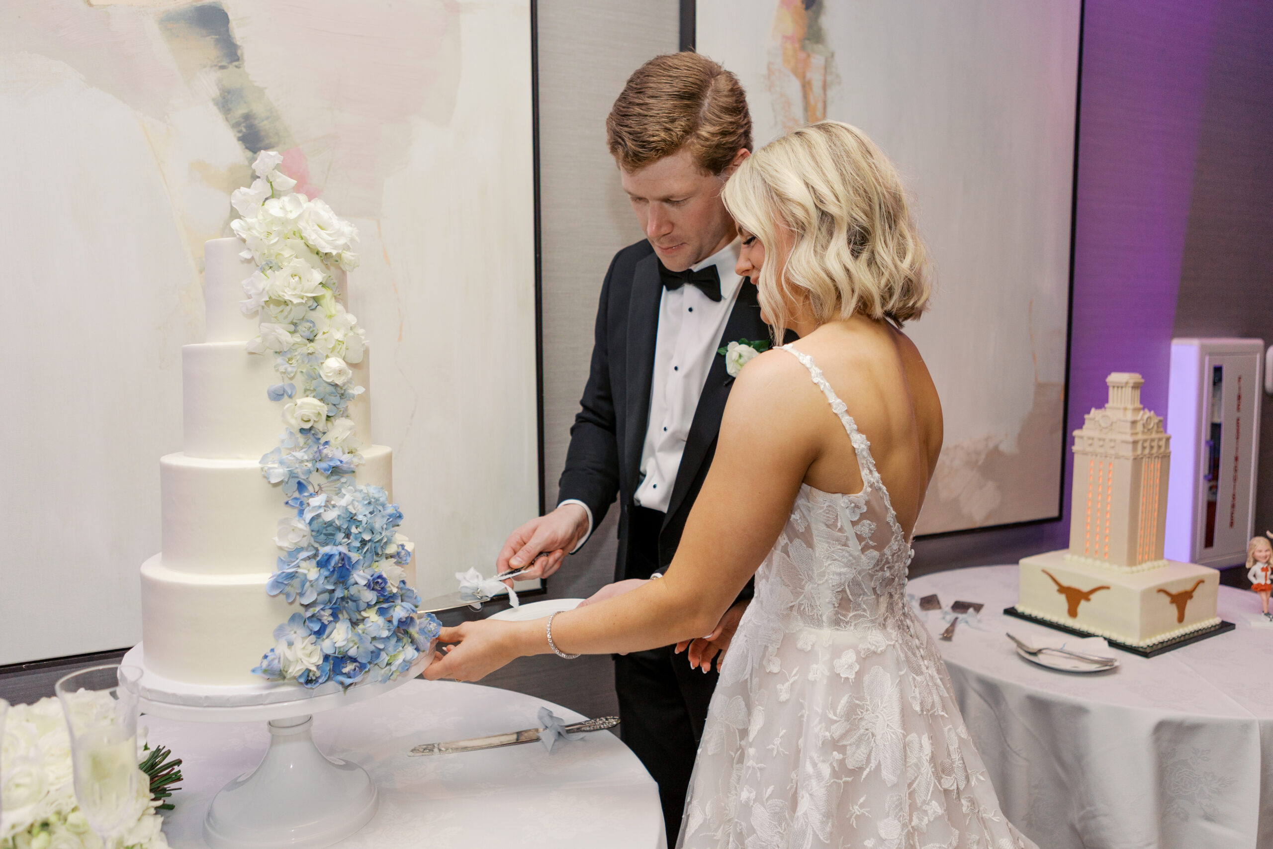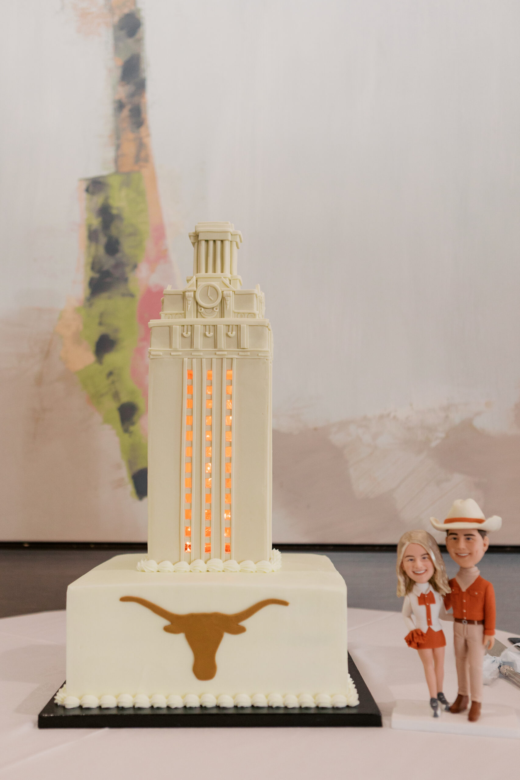 As cocktail hour came to a close, guests headed in for dinner and dancing! Brooke, Brooks, and their loved ones quickly filled the dance floor, enjoying the amazing music provided by Marquise Jones. Guests also admired two stunning cakes, Brooke’s white and blue ombré floral design and Brooks’ UT Tower-inspired groom’s cake made by Rayne Desserts. Beside his cake sat playful custom figurines of Brooke in her Texas cheer uniform and Brooks in his Spurs getup. The joy and details of the day were beautifully captured by Ashley Stathes, preserving memories the couple will treasure forever.