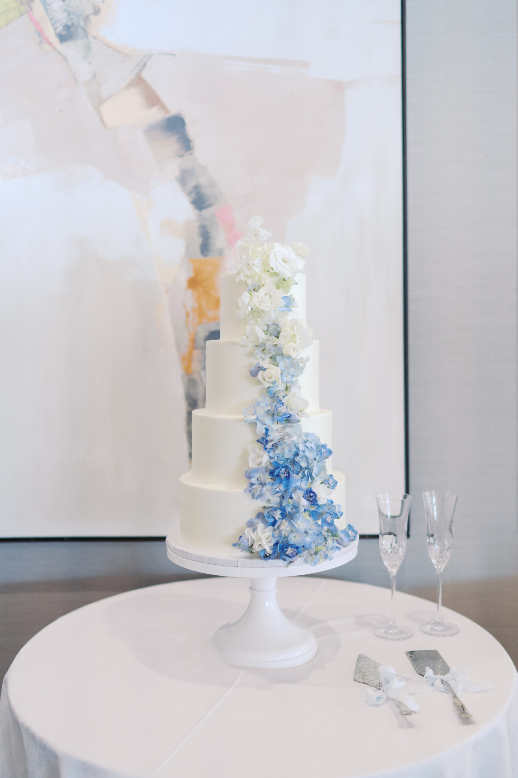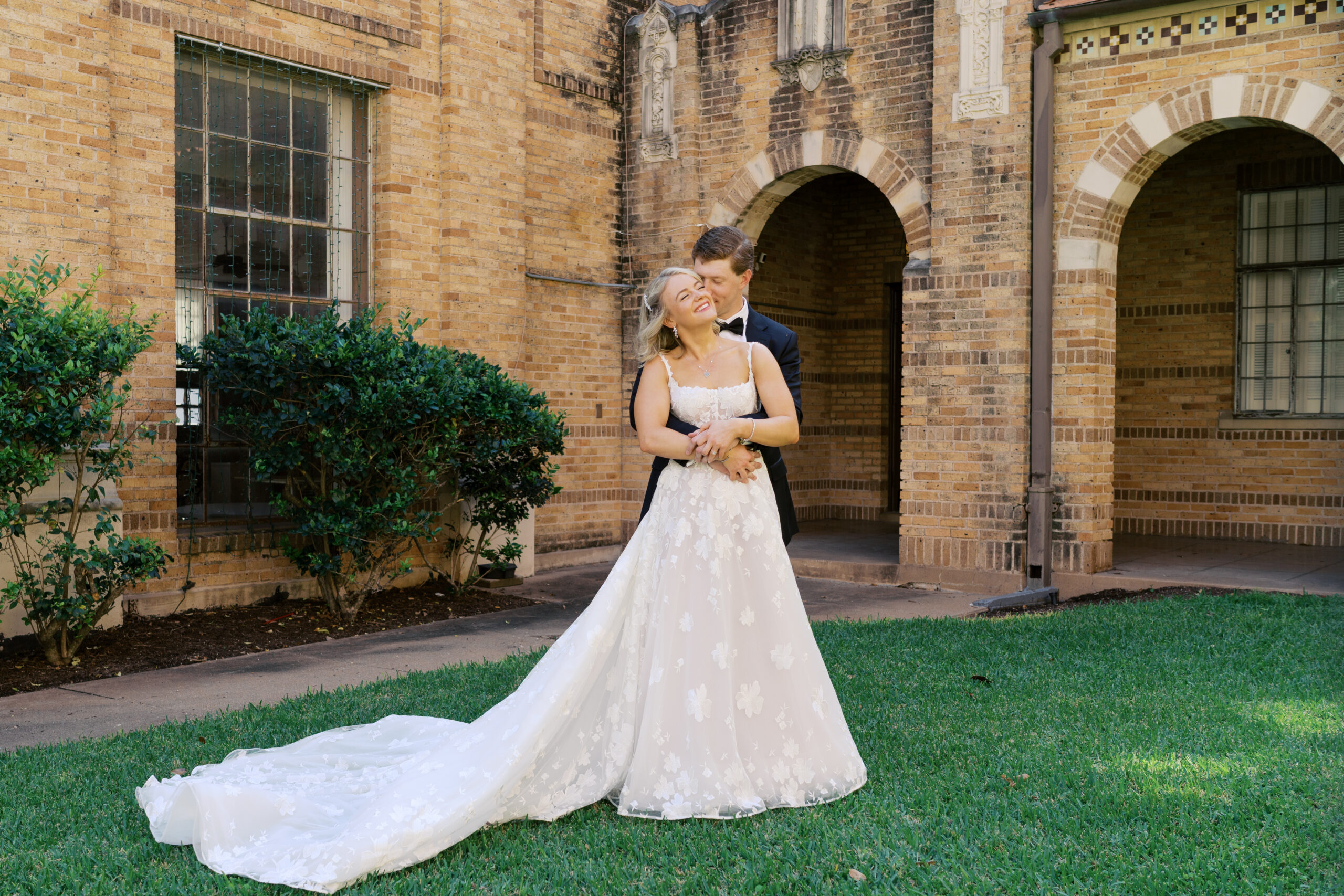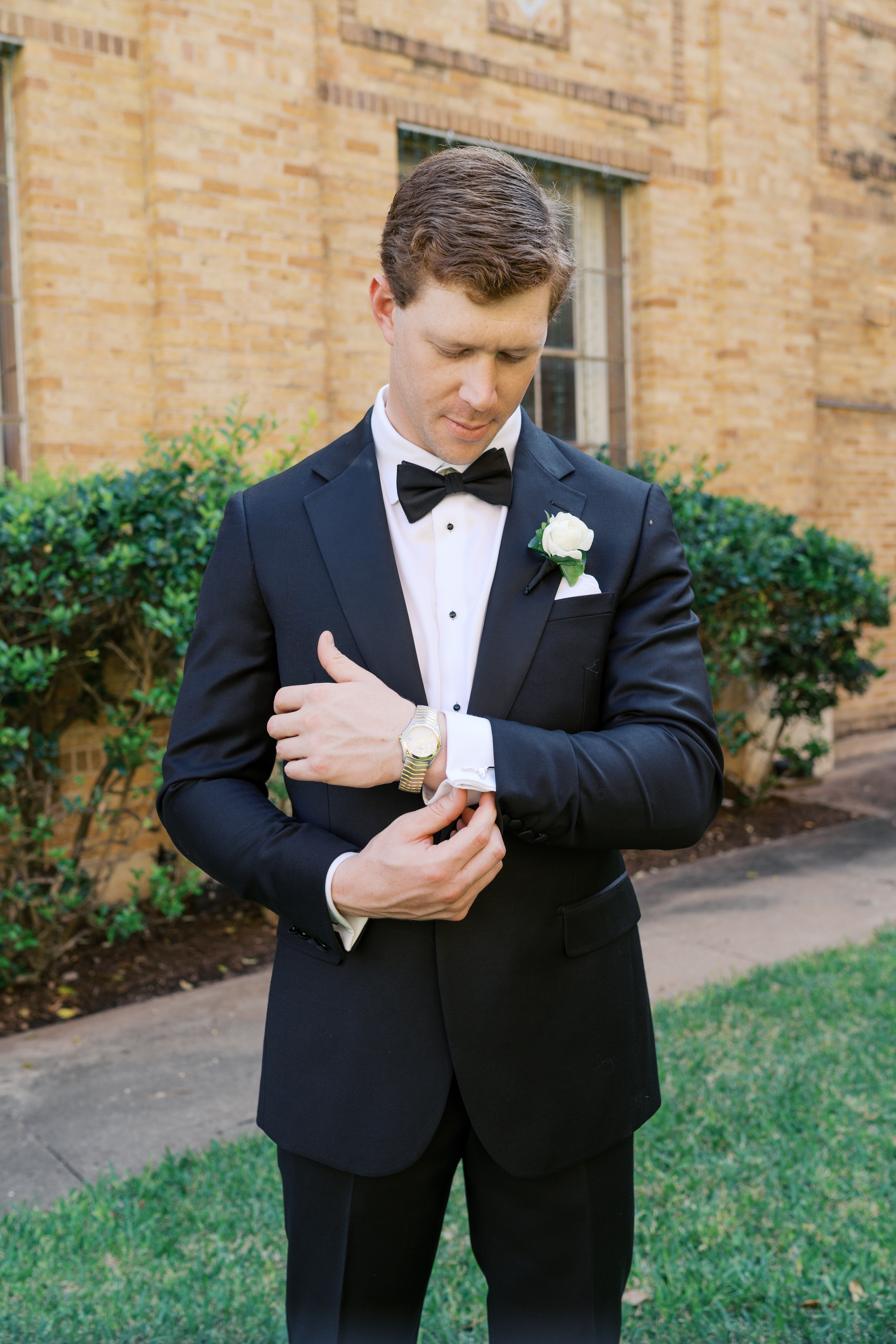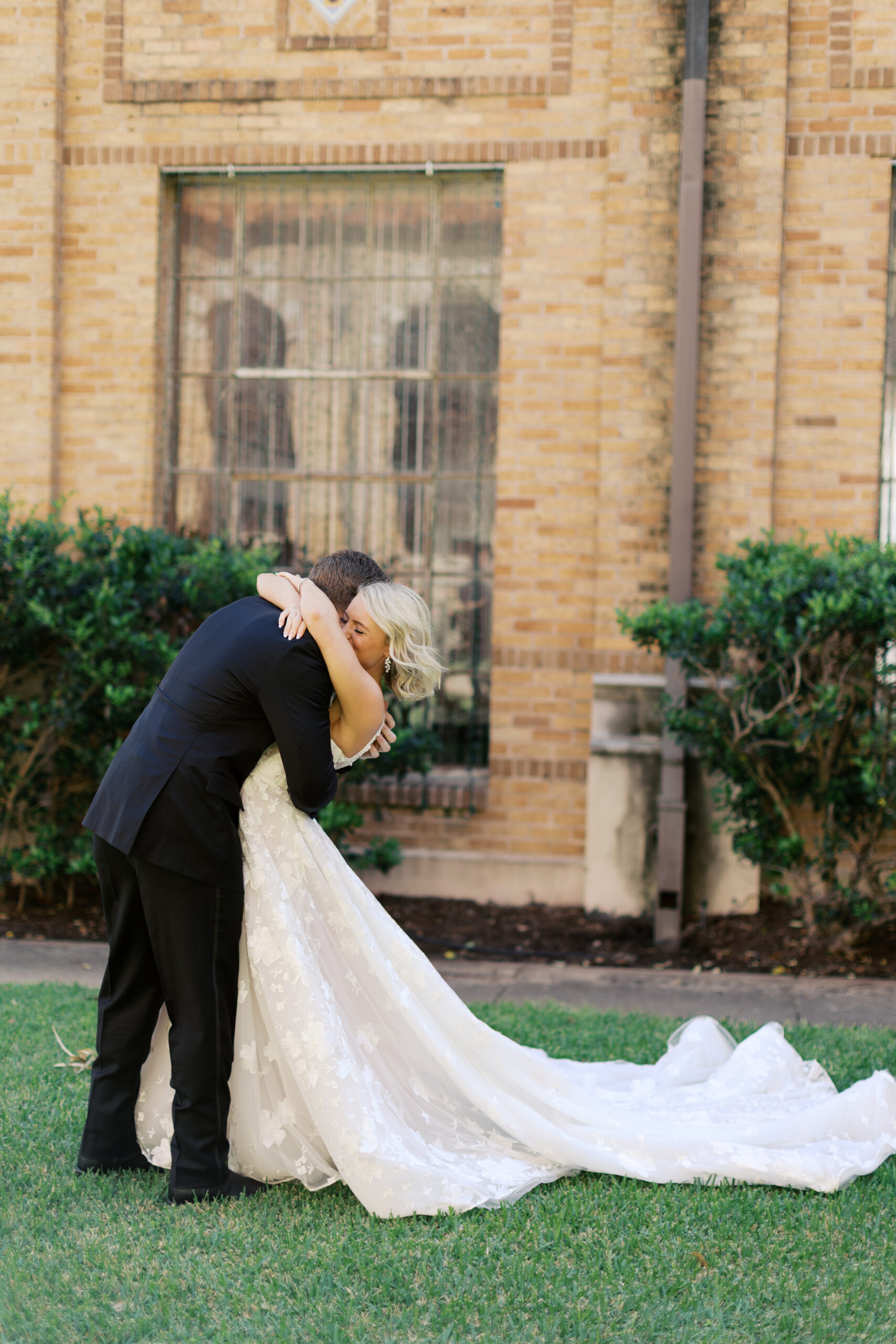 As cocktail hour came to a close, guests headed in for dinner and dancing! Brooke, Brooks, and their loved ones quickly filled the dance floor, enjoying the amazing music provided by Marquise Jones. Guests also admired two stunning cakes, Brooke’s white and blue ombré floral design and Brooks’ UT Tower-inspired groom’s cake made by Rayne Desserts. Beside his cake sat playful custom figurines of Brooke in her Texas cheer uniform and Brooks in his Spurs getup. The joy and details of the day were beautifully captured by Ashley Stathes, preserving memories the couple will treasure forever.