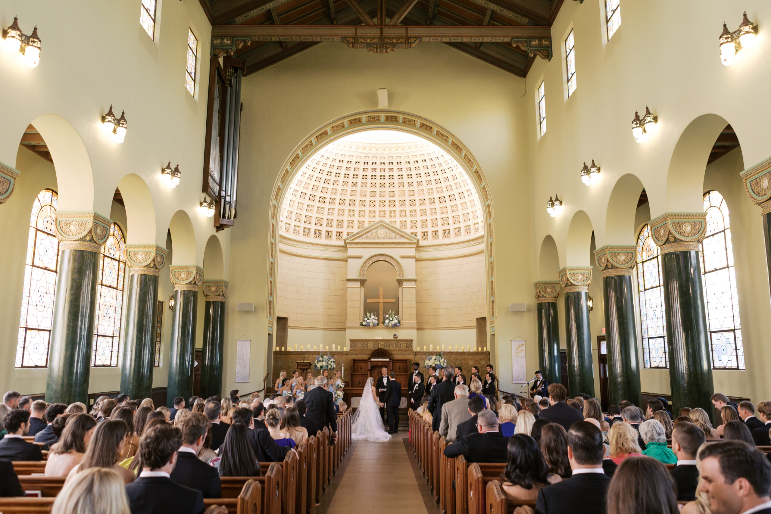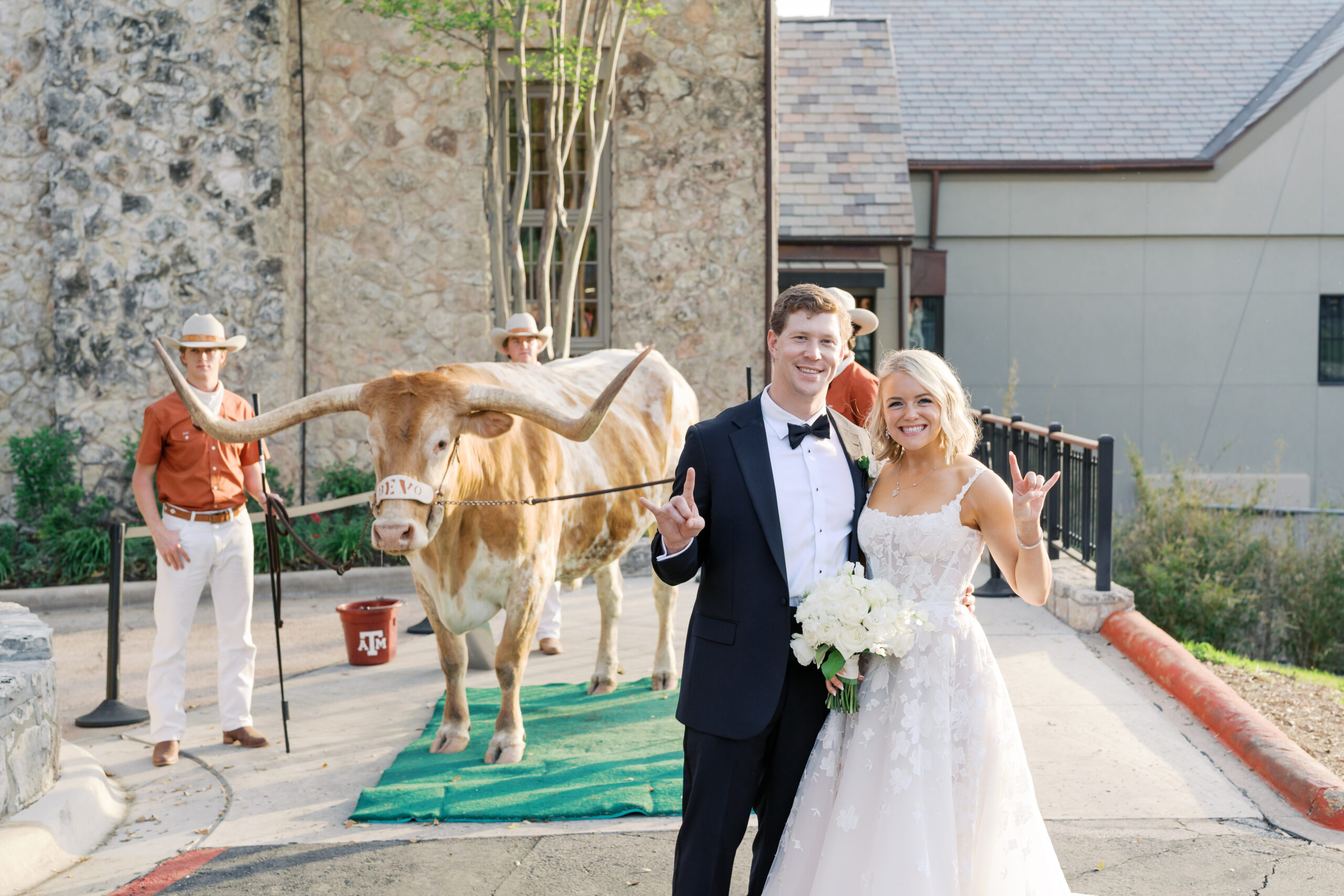 When it was time to say “I do,” guests gathered inside the stunning Central Christian Church, where the altar was beautifully adorned with lush florals by Bouquets of Austin. Once officially married, Brooke and Brooks made their way with family and friends to Westwood Country Club to kick off the festivities. In true Texas fashion, the celebration began with a surprise appearance by Bevo himself. As a proud former UT Spur, Brooks couldn’t imagine the day without his alma mater’s beloved mascot there to share in the joy. Guests were delighted to pose for photos with Bevo before moving into a lively cocktail hour, setting the tone for an unforgettable evening.