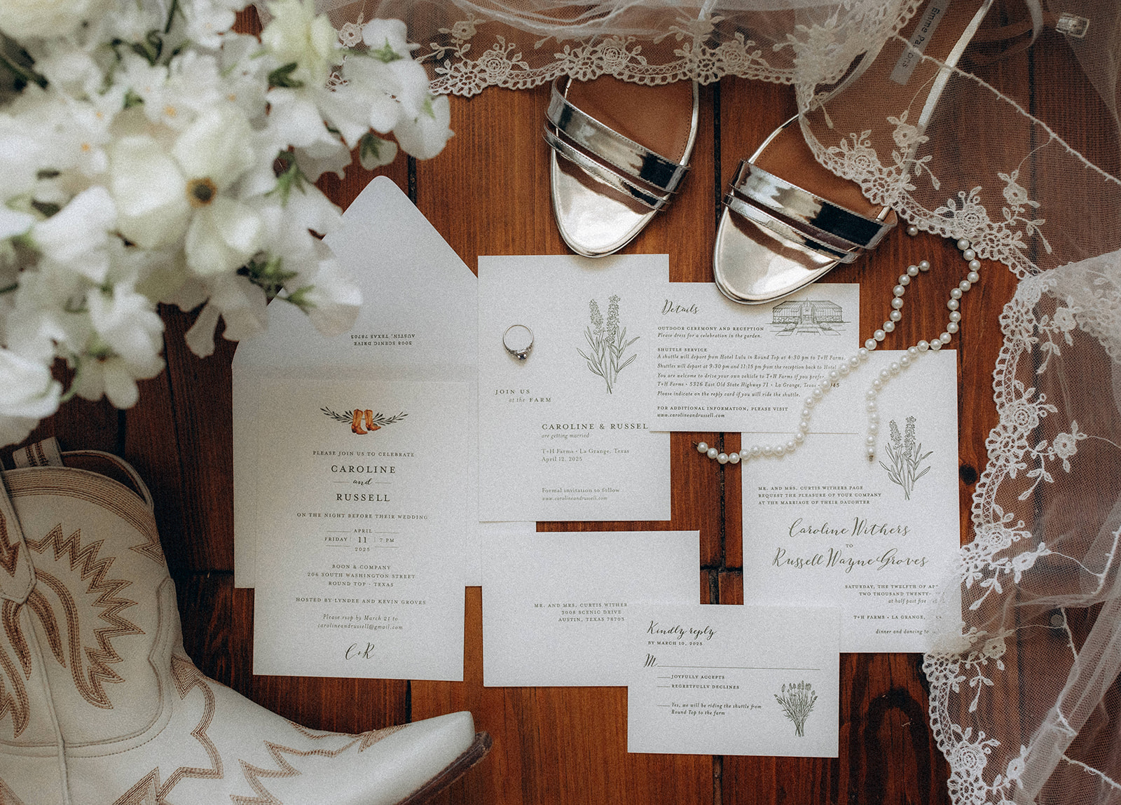 The celebration began as guests were shuttled from Austin to La Grange, setting the tone for a beautiful day ahead. As the evening unfolded, guests enjoyed the charm of this brand new property layered with personal touches that reflected Caroline and Russell’s vision. Every joyful moment and gorgeous detail was captured flawlessly by photographer Whit McGuire, ensuring this first wedding at Thompson+Hanson Farm will be remembered forever.